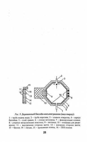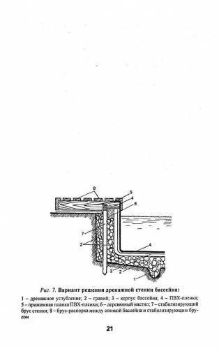 рейкой 19 и планкой 6. По выступу сливной трубы 8 вырезаем в пленке отверстие, надеваем пленку на трубу, расправляем, сверху надеваем резиновую прокладку 14, шайбу 13 и зажимаем гайкой 12. Надеваем (или навинчиваем) на выступающий конец трубы 9 сетчатый фильтр 15, и система слива смонтирована. Таким же образом прикрепляется к деревянному корпусу труба перелива 8. На рисунке 6 труба 16 подачи воды дана в стационарном исполнении. Но она может быть и без жесткой фиксации. Обсыпаем бассейн грунтом до высоты выступающей части деревянного каркаса. Со стороны лестницы 10 делаем небольшую площадку, выложенную кафелем. Это для того, чтобы не заносить грязь на ногах в бассейн. Для того, чтобы, хватаясь за края деревянного каркаса, не повредить пленку 3, накладываем облицовочные доски 19 шириной 10 см, которые фиксируются на упорах 2. Затем заполняем бассейн водой, сливаем воду через че- тыре часа, заполняем заново и - купальный сезон можно открывать. Материалы, которые обязательно понадобятся при со- оружении такого бассейна: 1. Доски деревянные - (желательно сосна) - шири- ной 200 мм, толщиной 25 мм и длиной 1800 мм -48 штук. 2. Доски деревянные (тоже сосна) - шириной 200 мм, толщиной 25 мм и длиной 2300 мм - 20 штук. 3. Брус деревянный (сосна) 50x50 мм, длиной 2500 мм - 12 штук. 4. Рейка деревянная 20 х 20 мм, длиной 2500 мм - 8 штук. 5. Пленка ПВХ (полиэтиленовая) -5x5 м. 6. Водопроводные трубы (ПВХ-трубы или цветной металл), диаметр - от 30 мм, общей длиной 10-15 м. 7. Насос электрический (откачивающий) - один, мощностью 1 кВт (для данного бассейна можно обойтись без подающего насоса, заполнение водой осуществлять из водопроводной сети). 8. Гравий (крупный песок) для устройства дренажа котлована - 3 м3. 9. Олифа, краска-эмаль (или лак) - по 3 банки. 10. Ножовка по металлу, ножницы для резки металла, плашка (клупп), гаечные ключи, ключ разводной, плоско- губцы, молоток, водопроводные вентили по потребности, гвозди, шайбы, прокладки. 11. Лестница для входа в бассейн (одна). Круглый бассейн. Исходя из описанной выше методики строительства деревянного бассейна 2,5x2,5 м, можно увеличить размер бассейна, делая его не квадратным, а, например, круглым (восьмигранник). Принцип возведения останется тем же. Деревянные доски сбиваете в щиты, удобные к пере- носке (например, щит из 11 досок, всего будет 8 щитов). Высота таких досок (щитов) определяется глубиной бассей- на (от 50 до 230 см). Еще раз считаем необходимым напомнить -доски должны быть сбиты очень плотно (луч- ше всего шпунтованные доски). Если где-то останется щель, то ПВХ-пленка будет вдавливаться в нее давлением воды и в конце концов прорвется. Появится течь, на устране- ние которой уйдет немало времени. Котлован. После того, как такие щиты подготовлены, приступаете к рытью котлована. Глубина. Глубина котлована будет зависеть от того, какой будет котлован (вкопанный или полувкопанный) и для кого он предназначен: детский -глубиной 50 см, взрослый -глуби- ной от 105 до 150 см, бассейн для прыжков в воду - с глубиной в месте прыжка не менее 320 см. Рытье котлована, подготовка дренажа дна и стенок котлована ничем не отличаются от того объема работ, кото- рые описаны нами ранее. Итак, котлован вырыт. Дренаж дна котлована выполнен (повторно его описывать нет необходимости). Дренаж стенок бассейна проведем после сборки в котловане 8 щитов -сте- нок бассейна. Сбитые щиты соединяются между собой в восьмигранни